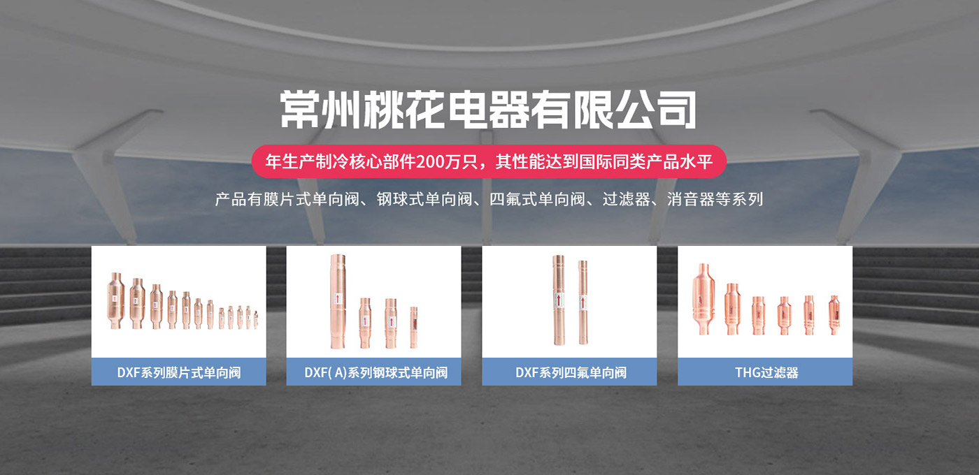 常州桃花電器有限公司地處中國長江“金三角”之稱的上海至南京高速公路、城際高鐵、常州高新經濟技術開發(fā)區(qū)路段,交通便利、技術力量十分雄厚。它是集研究、開發(fā)設計、制造和經營制冷核心部件的企業(yè),主要生產中央空調上使用的制冷部件。產品有膜片式單向閥、鋼球式單向閥、四氟式單向閥、過濾器、消音器等系列。年生產制冷核心部件200萬只,其性能達到國際同類產品水平。 企業(yè)擁有先進的科學技術、國際先進的生產加工設備和精密的檢測儀器,并已通過ISO9001質量體系及CE認證,公司歷史悠久,2000年起,經過長期積累、沉淀,經驗豐富,從而保證了產品的高質量、高性能、高耐用性。企業(yè)產品在國內外市場具有較高的知名度,深受眾多中外品牌制冷客商的好評。主要客戶有約克、麥克維爾、美的、開利、特靈、頓漢布什、清華同方、天加等.并出口北美、歐洲、東南亞等地區(qū)。 高品質產品是企業(yè)的保證,周到服務是合作友誼的承諾,企業(yè)本著“求